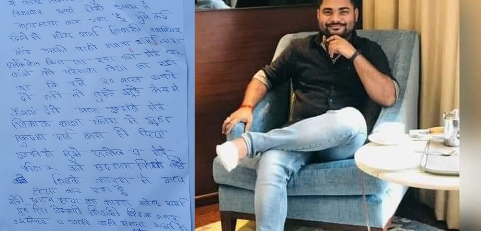पुलिस को मिले सुसाइड नोट में लिखा है- ” मैं यतेंद्र अपने होशो-हवाश में आत्महत्या कर रहा हूं. मुझे ग्वालियर निवासी रिटायर डीएसपी महेंद्र शर्मा और उनकी पत्नी ममता शर्मा ब्लैकमेल कर रहे थे. हमारे घर वालों से परेशान किया जा रहा था. हमसे 20 लाख रुपये की मांग कर रहे थे. न देने पर झूठे केस में फंसाने की धमकी दी जा रही थी. आज इन्होंने हजीरा थाने में मेरे खिलाफ झूठा केस दर्ज करा ही दिया. इन्होंने मुझे जलील और मेरे परिवार को बदनाम किया है. इसके कारण मैं आत्महत्या कर रहा हूं. मेरी आत्महत्या का कारण रिटायर्ड डीएसपी महेंद्र शर्मा और उनकी पत्नी ममता शर्मा हैं -यतेंद्र सिंह सिकरवार.”