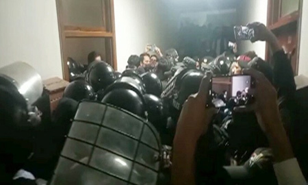 पाकिस्तान में इस्लामाबाद पुलिस ने पार्लियामेंट लॉज के अंदर तक घुसकर जेयूआई-एफ एमएनए सलाहुद्दीन अयूबी और मौलाना जमाल-उद-दीन सहित 19 लोगों को गिरफ्तार किया। पुलिस ने दावा किया कि उसने जमीयत उलेमा-ए-इस्लाम के स्वयंसेवी बल अंसारुल इस्लाम के सदस्यों की घुसपैठ के बाद यह कार्रवाई की।इस्लामाबाद के पुलिस महानिरीक्षक मुहम्मद अहसान यूनुस ने लॉज के अंदर कार्रवाई का बचाव करते हुए कहा कि इस ऑपरेशन का नेतृत्व हमने खुद किया है। पाकिस्तान में इमरान खान सरकार के खिलाफ अविश्वास प्रस्ताव आने के बाद से राजनीतिक सरगर्मियां बढ़ी हुई हैं। गुरुवार को मौलाना फजल-उर-रहमान की पार्टी के एक सांसद की गिरफ्तारी के बाद विपक्ष ने सरकार के खिलाफ जंग का ऐलान कर दिया है।