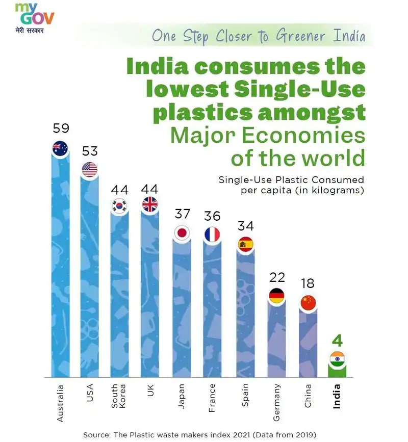 नई दिल्ली. भारत सबसे कम इस्तेमाल करने वाला देश है। दुनिया की दस बड़ी अर्थव्यवस्था वाले देशों में सिंगल यूज प्लास्टिक में भारत का पहला स्थान है जबकि ऑस्ट्रेलिया इस लिस्ट में सबसे नीचे हैं। भारत सरकार ने 2019 से 2021 के बीच ऑस्ट्रेलिया, अमेरिका, दक्षिण कोरिया, ब्रिटेन, जापान, फ्रांस, स्पेन, जर्मनी, चीन और भारत के लोगों द्वारा पैदा किए गए प्लास्टिक वेस्ट का डेटा जारी किया है।