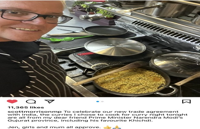 भारत-ऑस्ट्रेलिया के बीच शनिवार 2 अप्रैल को आर्थिक सहयोग और व्यापार का अहम समझौता हुआ। अगले शनिवार यानी 9 अप्रैल की रात ऑस्ट्रेलिया के प्रधानमंत्री स्कॉट मॉरिसन ने इस समझौते का जश्न मनाया। उन्होंने इसकी तस्वीर सोशल मीडिया साइट इंस्टाग्राम पर डाली, जिसमें वे खिचड़ी बनाते दिख रहे हैं।
