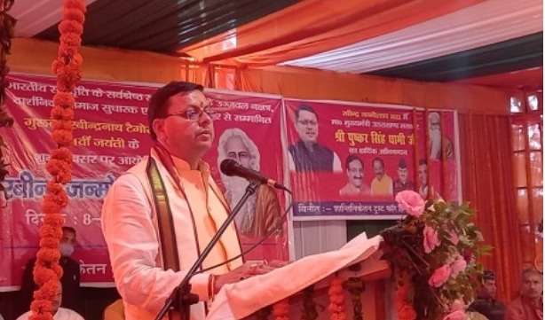 कार्यक्रम के दौरान संयोजक प्रोफ़ेसर अतुल जोशी, क्षेत्रीय विधायक राम सिंह कैड़ा, पूर्व विदेश सचिव शशांक, देवेंद्र ढेला देवेंद्र बिष्ट, भाजपा के मंडल अध्यक्ष कुंदन चिलवाल आदि जनप्रतिनिधि द्वारा मुख्यमंत्री को स्मृति चिन्ह, अंग वस्त्र देकर सम्मानित किया।मुख्यमंत्री धामी ने गुरुदेव रवीन्द्र नाथ टैगोर के 161वें जन्मोत्सव दिवस पर बधाई दी और रामगढ़ विश्व भारती केंद्रीय विश्वाविद्यालय के प्रथम परिसर का भी भूमि पूजन किया । उन्होंने कहा कि राज्य सरकार विकल्प रहित संकल्प के मंत्र पर अग्रसर है और जनकल्याण को समर्पित है। प्रधानमंत्री जी के नेतृत्व में सरकार जनकल्याण की भावना के अनुरूप लगातार प्रदेश का चहुमुखी विकास कर रही है। प्रधानमंत्री जी का राज्य के प्रति गहरा लगाव है।मुख्यमंत्री ने कहा की उनकी सरकार सबका साथ एवं सबका विकास के तहत कार्य करने के लिए दृढ़ संकल्पित है। रामगढ़ क्षेत्र के टैगोर टॉप स्थित गुरुदेव रवींद्रनाथ टैगोर की कर्म स्थली जहां उन्होंने 19वीं शताब्दी में 5 बार यहां आकर अपनी काव्य रचना की। उन्हें साहित्य का नोबेल पुरस्कार मिला जो किसी एशियाई को पहला नोबेल पुरस्कार था।मुख्यमंत्री ने कहा कि प्रधानमंत्री श्री नरेंद्र मोदी जी ने रामगढ़ में रवींद्रनाथ टैगोर विश्वविद्यालय के परिसर की स्थापना में अपनी रुचि व्यक्त की है, वह उत्तराखंड के लिए गर्व की बात है। इस सौगात से जहां विश्व भारती केंद्रीय विश्वविद्यालय उत्तराखंड को भारत के प्रमुख शिक्षा केन्द्र के रूप में स्थापित होने का अवसर प्राप्त होगा। वहीं स्थानीय युवाओं के लिए स्वरोजगार के नये अवसर उपलब्ध होंगे, तथा यह राष्ट्रीय एवं अन्तर्राष्ट्रीय शोधार्थियों के लिए भी नया गंतव्य बनेगा। इसके लिए केंद्रीय राज्य मंत्री पर्यटन मंत्री एवं न सांसद अजय भट्ट, डॉ. रमेश पोखरियाल निशंक के विशेष प्रयास रहे।उन्होंने कहा कि विश्व भारती की स्थापना के लिए प्रथम चरण में 150 करोड़ रूपये की डीपीआर केन्द्र सरकार में स्वीकृति की प्रक्रिया में है, उत्तराखंड सरकार द्वारा 45 एकड़ भूमि मे विश्व भारती केंद्रीय विश्वविद्यालय के परिसर की स्थापना की औपचारिकता पूर्ण कर ली गई । उन्होंने प्रो० विदयुत चक्रवर्ती, कुलपति विश्वभारती पश्चिम बंगाल तथा शांतिनिकेतन ट्रस्ट फॉर हिमालया के प्रवासियों को धन्यवाद ज्ञापित करते हुए कहा कि यह दशक उत्तराखंड का होगा।कार्यक्रम में राजकीय उच्चतर माध्यमिक विद्यालय रामगढ़ द्वारा सांस्कृतिक एवं देवभूमि सांस्कृतिक दल द्वारा छोलिया नृत्य की प्रस्तुति दी विभागों द्वारा उद्यान विभाग ग्रामीण आजीविका मिशन बोराकोट द्वारा स्टॉल भी लगाए।