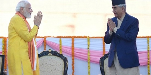 लुम्बिनी यात्रा के दौरान नेपाली प्रधानमंत्री शेरबहादुर देउबा का अभिवादन स्वीकार करते प्रधानमंत्री नरेंद्र मोदी