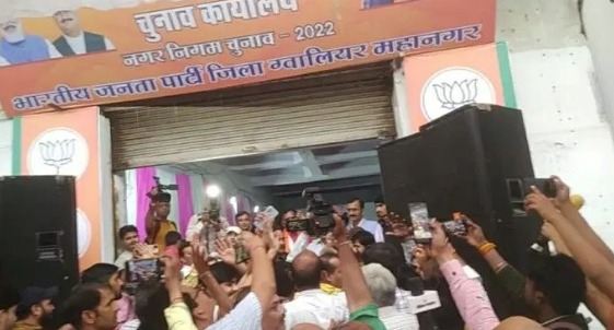 लोकमतसत्याग्रह/ग्वालियर। ग्वालियर में भाजपा के केंद्रीय चुनाव कार्यालय के उद्घाटन के दौरान आज असंतुष्ट कार्यकर्ताओं ने जमकर हंगामा किया। नाराज कार्यकर्ताओं ने टिकट वितरण पर विरोध जताते हुए राष्ट्रीय सह संगठन महामंत्री शिव प्रकाश, केंद्रीय मंत्री नरेंद्र सिंह तोमर सहित अन्य वरिष्ठ नेताओं के मौजूदगी में नारेबाजी की। नाराज कार्यकर्ताओं ने सांसद विवेक शेजवलकर की कार का घेराव किया। कार्यकर्ताओं ने भाजपा के एक नेता पर पैसे लेकर टिकट बेचने का गंभीर आरोप लगाया। भारतीय जनता पार्टी ने आज रविवार को अपने मुख्य चुनाव कार्यालय का उद्घाटन किया, कार्यक्रम ने राष्ट्रीय संगठन महामंत्री शिव प्रकाश, केंद्रीय कृषि मंत्री नरेंद्र सिंह तोमर, पूर्व मंत्री जयभान सिंह पवैया, सांसद विवेक शेजवलकर सहित अन्य नेता मौजूद थे। उद्घाटन समारोह में मौजूद सभी वरिष्ठ नेताओं ने कार्यकर्ताओं को एकजुट होकर ग्वालियर में भाजपा की महापौर और भाजपा के पार्षदों को जिताने की अपील की। उद्घाटन समारोह जैसे ही ख़त्म हुआ टिकट नहीं मिलने से नाराज कार्यकर्ता आक्रोशित हो गए और नारेबाजी करने लगे। उन्होंने पार्टी पर गलत लोगों को टिकट देने के आरोप लगाए। खास बात ये रही की ये सभी वरिष्ठ नेताओं की मौजूदगी में हुआ। नाराज कार्यकर्ताओं की नारेबाजी के बीच से ही राष्ट्रीय संगठन महामंत्री शिव प्रकाश, केंद्रीय कृषि मंत्री नरेंद्र सिंह तोमर सहित अन्य अतिथि वहां से निकल गए। टिकट नहीं मिलने से नाराज पार्षद पद के दावेदार भाजपा नेताओं ने लम्बे समय से पार्टी की सेवा कर रहे हैं और अब जब टिकट की बात आई तो पार्टी ने उनकी अनदेखी कर सिंधिया समर्थकों को टिकट दे दिए। नाराज नेताओं ने सामान्य सीट पर ओबीसी वर्ग के प्रत्याशी को टिकट दिए जाने पर भी विरोध जताया। विरोध जताने वाले भाजपा के कार्यकर्ता वार्ड 21, 50, 53 और 54 सहित अन्य वार्डों में दिए टिकट का विरोध कर रहे थे। वार्ड 21 से दावेदार कार्यकर्ता सतेंद्र सिंह गुर्जर ने एक बड़े नेता पर पैसे लेकर उनका टिकट कटवाने का गम्भीर आरोप भी लगाया। नाराज नेताओं ने सांसद विवेक शेजवलकर का घेराव किया, उनकी गाड़ी के सामने विरोध प्रदर्शन किया नारेबाजी की। उधर इस पुरे हंगामें पर केंद्रीय मंत्री नरेंद्र सिंह तोमर और सांसद विवेक शेजवलकर ने कहा कि जिसे टिकट नहीं मिलता वो नाराज होता है, कहीं विरोध नहीं है, सब एक जुट है।
