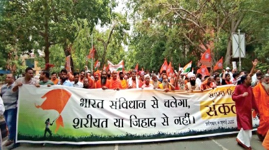 लोकमतसत्याग्रह/पिछले कुछ समय से देश भर में कट्टरपंथियों द्वारा जान-बूझकर अराजकता की स्थिति उत्पन्न की जा रही है। जगह-जगह उन्माद फैलाया जा रहा है। हिन्दुओं को बात-बात पर डराने-धमकाने की कोशिश की जा रही है। ‘सिर तन से जुदा’ के जिहादी नारे लगाती पगलाई भीड़ यहीं नहीं रुक रही, वह उदयपुर और अमरावती जैसी घटनाओं को अंजाम देकर देश को शरिया कानून के तहत चलाने की साजिशें रचती दिखाई दे रही है। शायद ही ऐसा कोई दिन जाता हो, जब देश के अलग-अलग इलाकों से जिहादियों की ओर से हिंदुओं के ‘सिर तन से जुदा’ करने की धमकी न आती हो। यानी नूपुर शर्मा का जो भी समर्थन करता दिखाई देता है, उसे डराया-धमकाया जाता है। दिल्ली, उत्तर प्रदेश, बिहार, झारखंड, छत्तीसगढ़, हरियाणा, महाराष्ट्र और राजस्थान इसके उदाहरण हैं। जाहिर है, देश का हिन्दू समाज न केवल जिहादी घटनाओं से व्यथित है, बल्कि आक्रोशित है। इस बाबत एकजुटता प्रदर्शित करने के लिए देश भर में अलग-अलग जगहों पर प्रदर्शन किए जा रहे हैं।इसी कड़ी में गत 9 जुलाई को समस्त हिन्दू समाज की ओर से नई दिल्ली स्थित मंडी हाउस से जंतर-मंतर तक संकल्प मार्च आयोजित किया गया। इस मार्च में दिल्ली-एनसीआर के 1,50,000 से अधिक हिन्दुओं ने भाग लिया। मजहबी उन्माद से आक्रोशित सभी लोगों का स्पष्ट कहना था कि ये देश संविधान से चलेगा, शरीयत या जिहाद से नहीं। इस दौरान बच्चों से लेकर युवा तक, महिलाओं से लेकर वृद्ध तक सभी ‘वंदे मातरम्’, ‘जय श्री राम’, ‘भारत माता की जय’, ‘जो हिन्दू हित की बात करेगा, वही देश पर राज करेगा’, ‘कन्हैया-उमेश के हत्यारों को फांसी दो-फांसी दो’, ‘जिहादी हिंसा नहीं सहेंगे’ जैसे नारे लगाए जा रहे थे।
