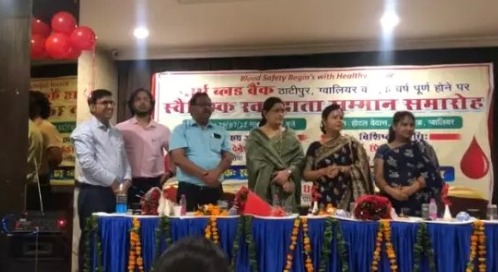 लोकमतसत्याग्रह/ग्वालियर।ग्वालियर शहर में पहली बार पार्थ ब्लड बैंक थाटीपुर द्वारा स्वेच्छिक रक्तदाता सम्मान समारोह का आयोजन किया गया। इस समारोह में 100 से अधिक ऐसे रक्तदाताओं का सम्मान किया, जो समय समय पर जरूरतमंद लोगों के लिए ब्लड और प्लेटलेट्स डोनेट करते हैं। इस आयोजन के मुख्य अतिथि के रूप में डॉ दिनेश उदेनिया डीन मेडिकल कॉलेज और विशिष्ट अतिथि डॉ प्रियवंदा भसीन अध्यक्ष IMA ग्वालियर उपस्थित रहे। रक्तदाताओं के साथ शहर के उन सभी ब्लड कोऑर्डिनेटर का भी सम्मान किया गया, जो जरूरत पड़ने पर मरीज की ब्लड की व्यवस्था करवाने में मदद करते हैं। अतिथियों ने स्वेच्छिक रक्तदाताओं का उत्साहवर्धन किया और शहरवासियों से अपील की कि अदिकाधिक संख्या में सभी रक्तदान करें एवं अपने पड़ोसियों ,रिश्तेदारों को भी जागरूक करें। जिससे रक्त की कमी से कभी किसी के जीवन का अंत नहीं हो। ब्लड बैंक प्रभारी डॉ सुनील शर्मा एवं संचालक रीना शर्मा ने बताया कि पार्थ ब्लड बैंक में थेलेसीईमिया मरीजों के लिए निः शुल्क ब्लड उपलब्ध करवाया जाता है। कैंसर मरीज,एनीमिक मरीज,डिलीवरी मरीज आदि सभी के लिए ब्लड बैंक द्वारा समय समय पर ब्लड की व्यवस्था उनकी जरूरत के हिसाब से पूरी करने की कोशिश की जाती है। ब्लड बैंक का संचालन स्वर्गीय धनवंती देवी जन सेवा समिति चेरिटेबल संस्था के द्वारा किया जा रहा है।कार्यक्रम के दौरान संस्था की सचिव प्रियंका शर्मा, कोषाध्यक्ष नमन शर्मा एवं समस्त पदाधिकारी मौजूद रहे। मंच का संचालन पुर्णिमा अग्रवाल एवं अंशु शर्मा द्वारा किया गया। इस समारोह में नितिन शर्मा एडवोकेट, योगेश अरोरा, निर्मल संतवानी, हरीश थोरानी, अरविंद राजावत, सूरज मोडवेल, दिलीप शर्मा, प्रवीण भारद्वाज, जितेंद्र जाजू, शैलेन्द्र सिंह भदौरिया आदि रक्तदाताओं ने अपनी उपस्थिति दी।