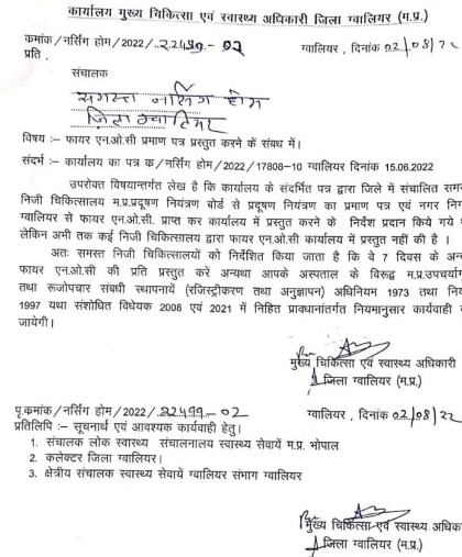 लोकमतसत्याग्रह/ग्वालियर।जबलपुर के न्यू लाइफ हॉस्पिटल अग्निकांड से सबक लेते हुए अब ग्वालियर जिला प्रशासन सुरक्षा उपायों को लेकर जाग गया है। ग्वालियर CMHO ने जिले के सभी निजी अस्पतालों को सात दिनों ने अंदर फायर NOC उनके कार्यालय में प्रस्तुत करने के निर्देश दिए हैं। CMHO डॉ मनीष शर्मा ने आज मंगलवार को एक पत्र जारी कर सभी निजी अस्पतालों को निर्देश दिए हैं कि पिछले दिनों आप सभी को प्रदूषण नियंत्रण बोर्ड से प्रदूषण नियंत्रण का सर्टिफिकेट और नगर फायर एनओसी प्राप्त कर कार्यालय में जमा करने के निर्देश दिए थे लेकिन कई निजी अस्पतालों ने इसे जमा नहीं किया। CMHO ने निर्देश दिए कि इस पत्र से 7 दिन के अंदर मुख्य चिकित्सा एवं स्वास्थ्य अधिकारी कार्यालय में फायर एनओसी आवश्यक रूप से जमा करें अन्यथा विधि अनुरूप कार्रवाई की जाएगी। गौरतलब है कि जबलपुर के जिस न्यू लाइफ हॉस्पिटल में अग्निकांड हुआ उसकी फायर NOC चार महीने पहले ही समाप्त हो चुकी थी और स्वास्थ्य विभाग के अफसरों की कृपा से वो प्रोविजनल NOC के चल रहा था। खास बात ये है कि मार्च 2022 में न्यू लाइफ हॉस्पिटल की फायर NOC समाप्त हो गई थी उसे तत्काल प्रभाव से अग्निशमन यंत्र लगाने थे जो उसने नहीं लगाये जिसका नतीजा ये हुआ कि जब अस्पताल में आग लगी तो आग पर काबू पाने के लिए कोई व्यवस्था नहीं थी और अफसरों एवं अस्पताल प्रबंधन की लापरवाही से 8 लोगों को जान चली गई। 10 लोग अभी भी जिंदगी और मौत से जूझ रहे हैं।