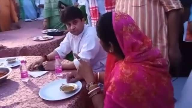लोकमतसत्याग्रह/ग्वालियर में केंद्रीय मंत्री ज्योतिरादित्य सिंधिया का अनोखा अंदाज देखने को मिला। उन्होंने अनुसूचित जाति के लोगों को ना केवल अपने हाथ से खाना परोसा, बल्कि साथ बैठकर एक ही थाली में खाना भी खाया। सिंधिया घराने में शायद पहली बार किसी ने ऐसा किया हैं। इस दौरान सिंधिया की कट्टर समर्थक इमरती देवी भी मौजूद थीं। सिंधिया की एक बात पर वह भावुक हो गईं। उन्होंने कहा- ये बात गलत है। इस पर मंत्री सिंधिया बोले- ये बात अभी मत कहो-यहां मीडिया वाले मौजूद हैं।