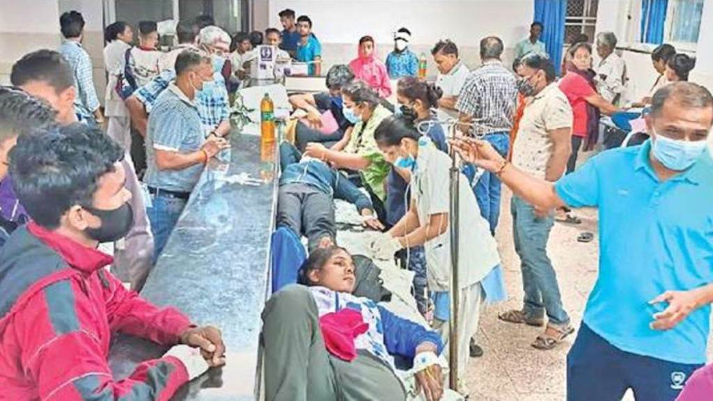 लोकमतसत्याग्रह/कंपकपी और घबराहट के बीच एलएनआइपीई के सैकड़ों छात्र-छात्राएं हजार बिस्तर अस्पताल पहुंचे,अफरा-तफरी के माहौल के बीच छात्रों को रिसेप्शन पर लेटाना पड़ा, तत्काल इलाज शुरू किया गया, कुछ छात्रों को बेड के इंतजार में जमीन पर भी बैठना पड़ा। हजार बिस्तर के डाक्टर व स्टाफ भी इतनी बड़ी संख्या में मरीजों को एकदम से नहीं संभाल पा रहे थे। सिरदर्द, उल्टी, और बुखार की शिकायत सबसे ज्यादा थी।