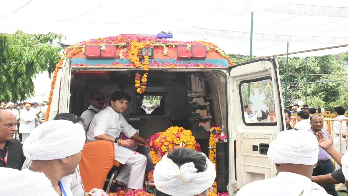 विमानतल से विशेष वाहन से पार्थिव देह को रानी महल ले जाते समय केंद्रीय मंत्री ज्योतिरादित्य सिंधिया अपनी मां के साथ बैठे रहे और उन्हें ही निहारते रहेा