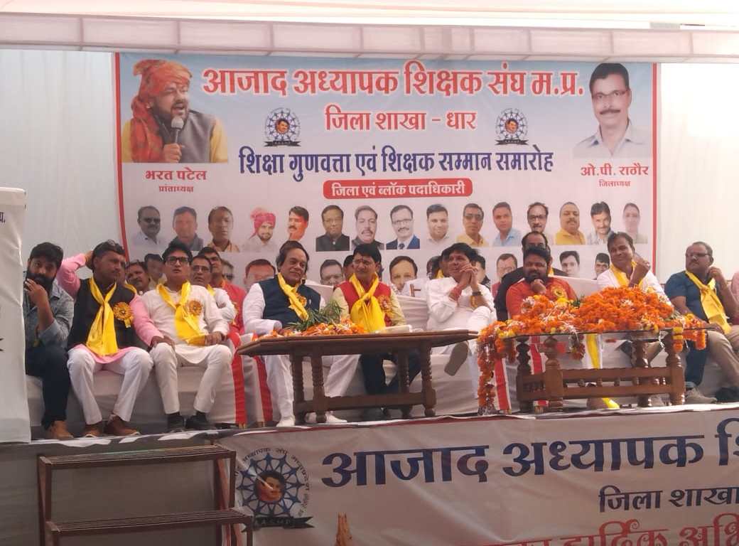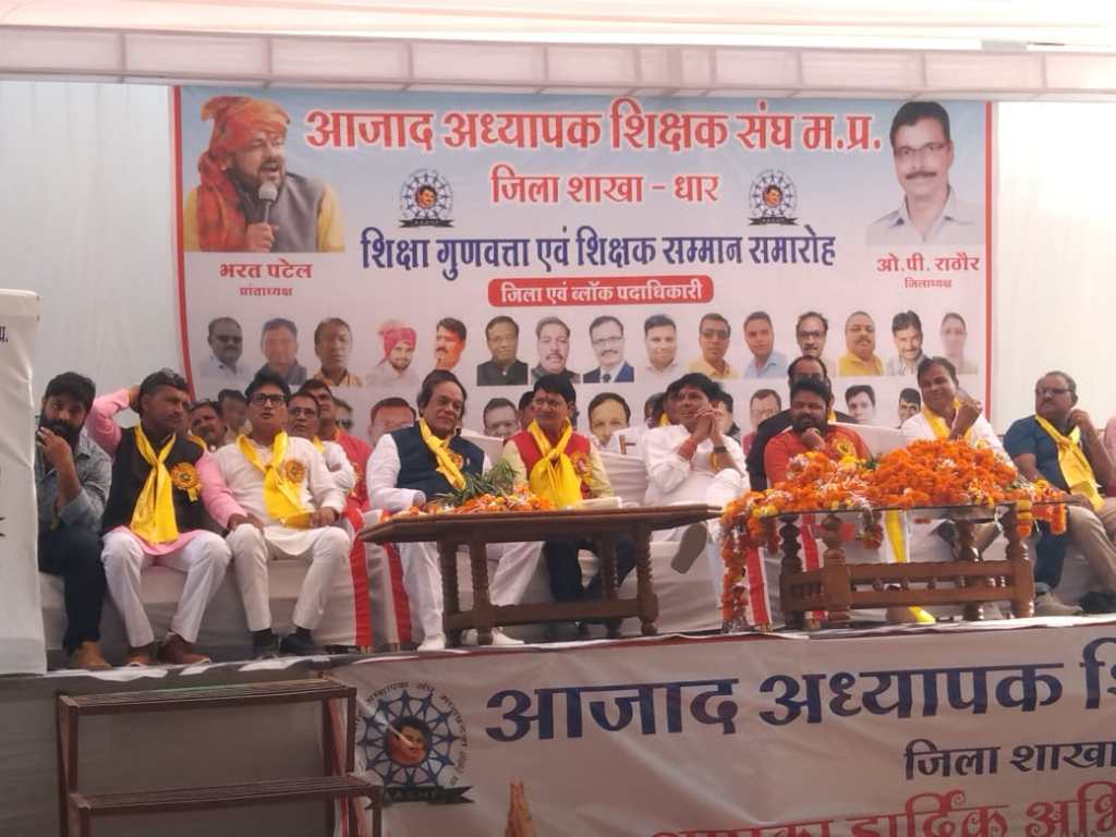 कार्यक्रम के दौरान शिक्षकों की समझ में भूमिका पर अतिथियों द्वारा व्याख्यान किया साथ ही गुरु परंपरा का निर्वहन करते हुए समस्त शि से आव्हान किया गया कि आप राष्ट्रहित में तथा राष्ट्र निर्माण में अपनी भूमिका का निर्वाहन अवश्य करें साथी आने वाली पीडियो को अच्छे अवसर हेतु तैयार करें जिला अध्यक्ष ओपी राठौर द्वारा स्वागत भाषण में शिक्षको की पीड़ा के बारे में बताया गया तथा शासन से मांग की गई थी शिक्षकों को सिर्फ शैक्षिक की दायित्वों के लिए निर्माण करने की क्षमता की प्रशंसा की गई आजाद अध्यापक संघ प्रांताध्यक्ष भरत पटेल द्वारा वेतन विसंगतियां तथा उच्च प्रभार, सेवा अवधि आदि पर खुलकर चर्चा की गई पूर्व राज्य मंत्री राजेश अग्रवाल द्वारा शिक्षकों की समस्या को सरकार तक पहुंचाने की बात कही गई कार्यक्रम में धार जिले के संपूर्ण 13 विकासखंड में पदस्थ शिक्षकों के द्वारा उत्कृष्ट सेवा प्रदान करने वाले शिक्षकों को अतिथियों द्वारा सम्मानित कर स्मृति चिन्ह प्रदान किए गए