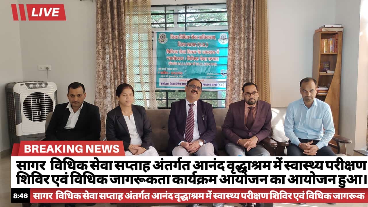 लोकमत सत्याग्रह/नीरज वैधराज /सागर म.प्र. राज्य विधिक सेवा प्राधिकरण, जबलपुर के दिशा निर्देशानुसार एवं माननीय प्रधान जिला एवं सत्र न्यायाधीश महोदय/अध्यक्ष जिला विधिक सेवा प्राधिकरण, सागर महेश कुमार शर्मा के मार्गदर्शन में दिनांक 04 नवंबर से 09 नवंबर तक आयोजित होने वाले न्यायोत्सवः विधिक सेवा सप्ताह अंतर्गत दिनांक 05.11.2024 को आनंद वृद्धाश्रम में स्वास्थ्य परीक्षण शिविर एवं विधिक जागरूकता कार्यक्रम का आयोजन किया गया।