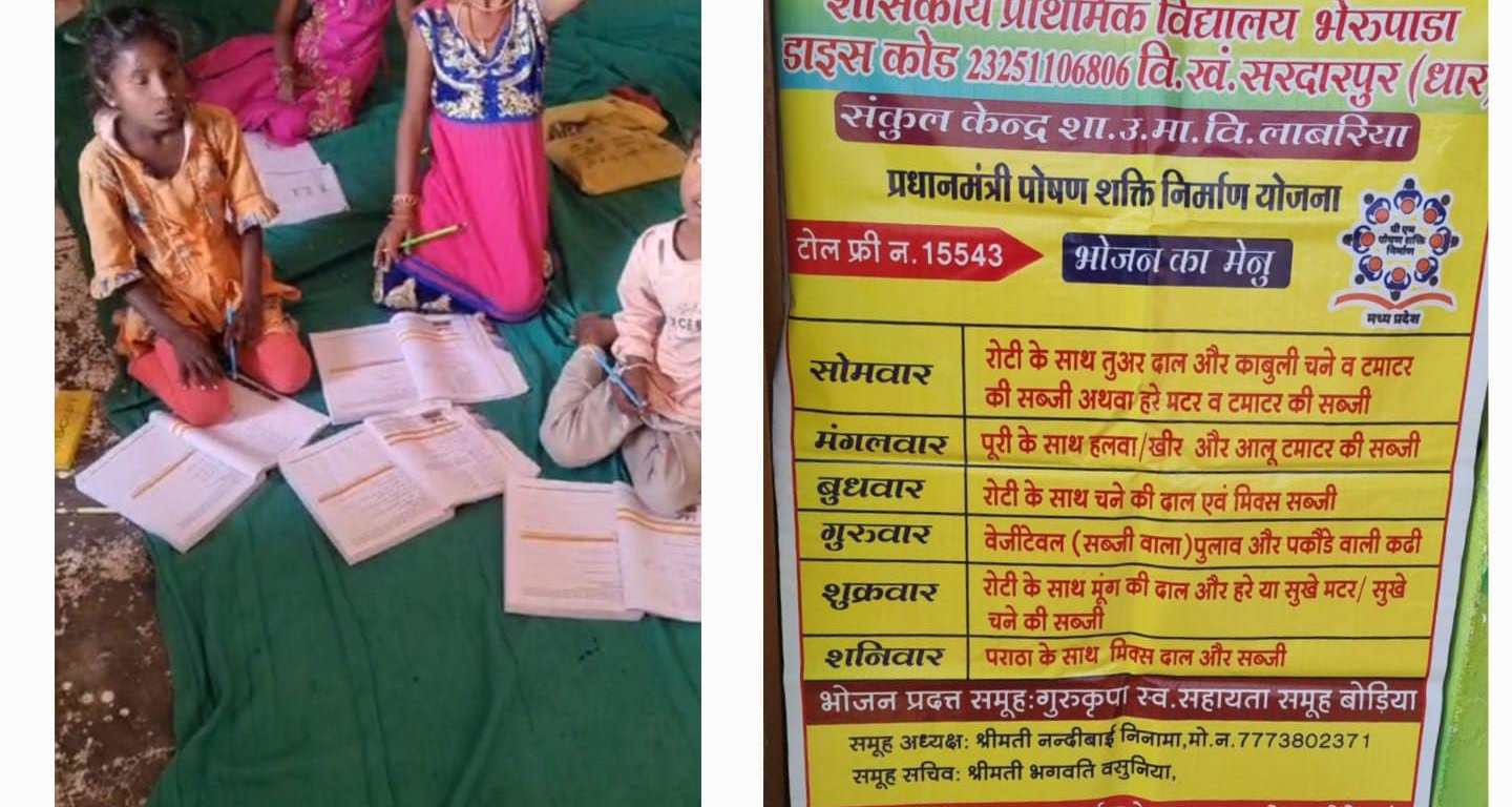 सोमवार से लेकर शनिवार तक शासन की ओर से बच्चों को दिए जाने वाले भोजन के मेनू बनवाकर दिया गए हैं ताकि सही समय पर बच्चों को शासन से मिल रहे योजना के अंतर्गत भोजन का लाभ मिल सके लेकिन एक भी सहायता समूह इन आदेशों का पालन नहीं करता दिखाई दे रहा है । बात करें मामला सरदारपुर जनपद की लाबरिया संकुल के मसारपाड़ा गुलरीपाड़ा भैरू पाड़ा मजरो में स्थित विद्यालयो का है । जहां पर पत्रकार द्वारा स्कूलों का निरीक्षण किया तो बच्चों को समय पर ना तो भोजन मिला और अधिकांश जगह अपने मेनू के हिसाब से भोजन में कमी पाई गई जिसके साथ ही गुरुवार के मीनू में वेजिटेबल पुलाव खिचड़ी- पकोड़ा कडी का प्रावधान चार्ट में दर्शाया गया था परंतु मजरों में विद्यालय होने से व सहायता समुह के द्वारा नियमों को ताक में रखकर मध्यान भोजन नियम की धज्जियां उड़ाई तथा बच्चों को सिर्फ खिचड़ी देकर अपनी जिम्मेदारियां से इतिश्री कर लिया गया प्रतीत हुआ।