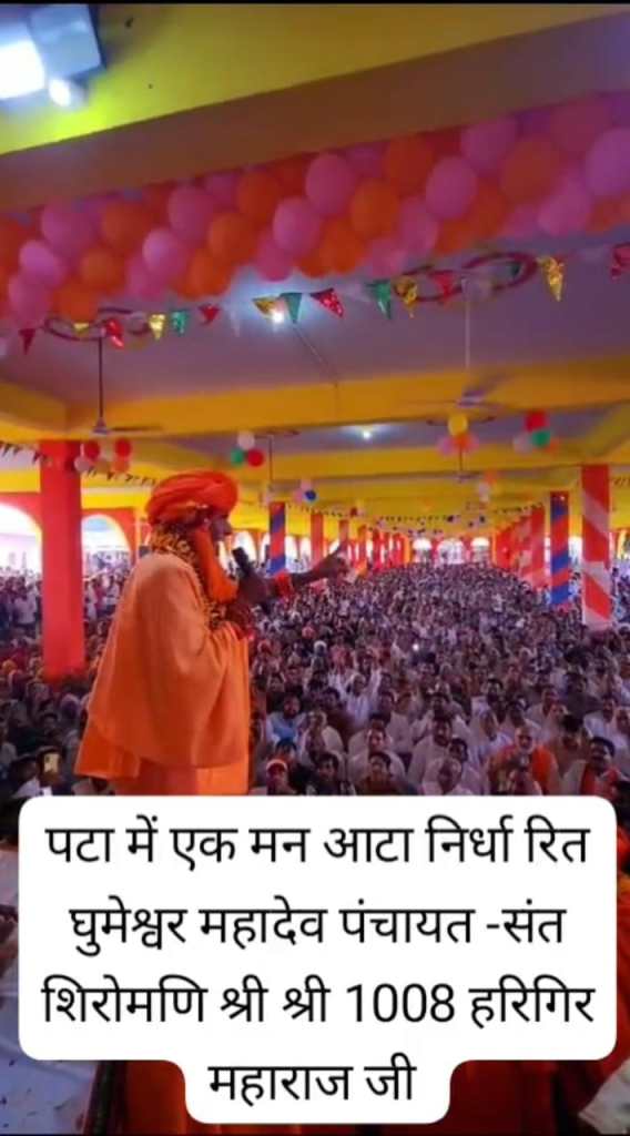 जिसमे कुरीतियां नाशक, यूपी राजस्थान मध्य प्रदेश के लगभग 14 से अधिक जिलों के हजारों गांवों के लोगों को लगभग 70 से अधिक महापंचायतो के माध्यम से शराब,दहेज,मृत्युभोज,कन्या भ्रूण हत्या आदि को बंद कराने वाले महान संत श्री श्री 1008 संत शिरोमणि श्री हरिगिरि महाराज जी डबरा धूमेश्वर धाम सैकड़ों गाड़ियों ओर हजारों भक्तों के काफिले के साथ पहुंचे जिसमे धूमेश्वर धाम के संत श्री श्री 1008 अनिरूद्धचार्य तथा अनेक महान संतो की उपस्थिति मंच पर आसीन हुई हज़ारों क्षेत्रीय लोगों के बीच महापंचायत का आयोजन हुआ जिसमें श्री श्री 1008 संत शिरोमणि श्री हरिगिरि महाराज जी शराब दहेज मृत्युभोज बंदी को लेकर संकल्प दिलाया और जो नई सामाजिक कुरीति श्राद्ध (पटा) भोज को सर्व समाज कल्याण हेतु एक मन आटा में भोज करने को निर्धारित किया सभी ने हाथ उठाकर सहमति दी।।