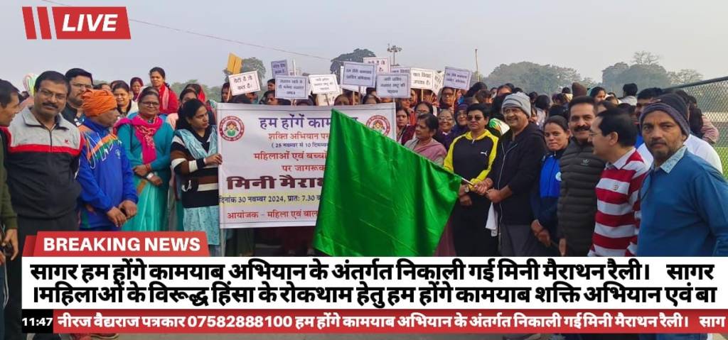 लोकमत सत्याग्रह/नीरज वैद्यराज/सागर ।महिलाओं के विरूद्ध हिंसा के रोकथाम हेतु हम होंगे कामयाब शक्ति अभियान एवं बाल विवाह विरुद्ध अभियान के तहत सागर कलेक्टर संदीप जी आर के निर्देश पर महिला बाल विकास विभाग, स्कूल शिक्षा विभाग सहित अन्य विभागों के माध्यम से जनजागरूकता कार्यक्रम की श्रृंखला में मिनी मैराथन दौड़ का आयोजन किया गया,