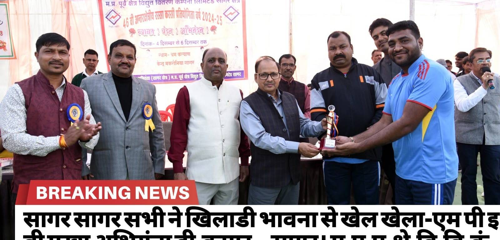 प्रथम, द्वितीय एवं तृतीय स्थान प्राप्त विजयी टीमो को शील्ड प्रदान की गई। उत्कृष्ट खिलाडियो को पारितोषिक एवं टीमो को व्यक्तिगत घोषित नगद पुरस्कार प्रदान किए गए। कार्यक्रम का सफल संचालन जिनेश जैन द्वारा एवं आभार सहायक अभियंता अवनीश जारोलिया द्वारा व्यक्त किया गया। प्रतियोगिता के समापन अवसर पर कार्यक्रम मे श्रीमति चंद्ररेखा प्रभाकर, पी.एल. रन्धे, श्रीमति शांति परते, वीरेन्द्र परते, अजीत चौहान, मनोज रौतेल, मनीष कुमार, सी.एस. पटेल, कमल कुमार, सी.एस. झरवडे, अजय नामदेव, नवीन मालवीय, संजय पाराशर, मनोज जैन, पवन रावत, डी.पी. प्रजापति, रामविवेक गौतम, रोहित शर्मा, विनय नामदेव, नंदराम, राजेश दरयानी, सुरेन्द्र सोनी, सौरभ गुरू, विनोद कन्नौजिया, नारायण प्रसाद, श्रीमति संगीता जैन अर्चना गुप्ता, संगीता कुशवाहा, शैलजा रजनी सहित बडी संख्या मे अधिकारी कर्मचारी महिलाएं एवं दर्शक उपस्थित थे।