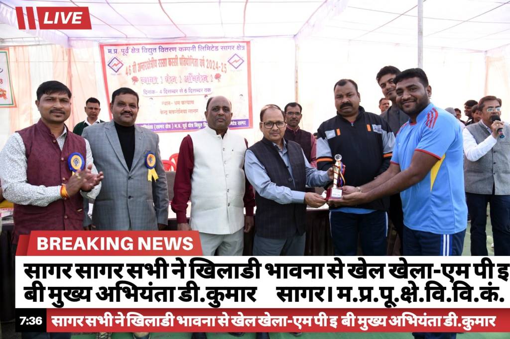 लोकमत सत्याग्रह / नीरज वैद्यराज /सागर, म.प्र.पू.क्षे.वि.वि.कं.लि.सागर द्वारा आयोजित 46 वी अंतर्क्षेत्रीय रस्सा कशी खेल प्रतियोगिता का आज समापन हो गया। इस अवसर पर कार्यक्रम को संबोधित करते हुए मुख्य अभियंता (सा.क्षे.) डी. कुमार ने कहा कि सभी ने खिलाडी भावना से खेल खेला और एक दूसरे का उत्साहवर्धन किया। डी कुमार ने कहा कि खेल मे हार जीत तो होती ही है परन्तु खिलाडी भावना से खेलना, बिना किसी विवाद के अंजाम तक पहुॅचना उपलब्धि है। प्रतियोगिता प्रभारी अधीक्षण अभियंता डी.एन. चौकीकर ने अपने संबोधन में विजयी टीमो को बधाई देते हुए सफल कार्यक्रम के लिए सहयोगियो का आभार जताया कार्यक्रम कोे आर.आर. पाराशर फेडरेशन एवं के.एल. रैकवार महासंघ तथा खेल आब्जर्वर सूर्यभान शर्मा जबलपुर ने भी संबोधित किया।