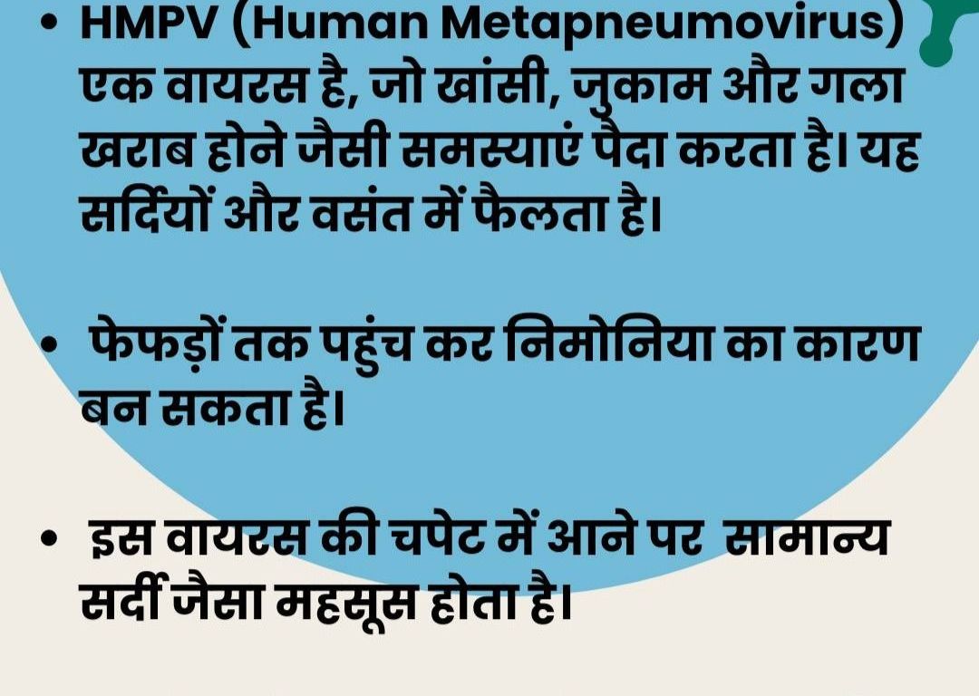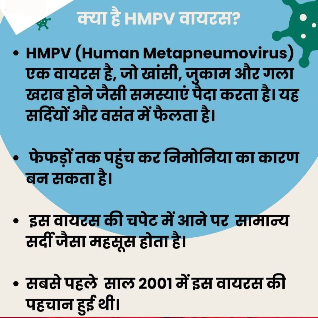 एचएमपीवी को ह्यूमन मेटान्यूमोवायरल कहा जाता है। यह सामान्य सर्दी-जुकाम की तरह दिखता है। इस वायरस से संक्रमित व्यक्ति के खांसी, गले में घरघराहट, खराशे और नाक बहने लगती है। कमजोर इम्यूनिटी वालों के लिए यह गंभीर खतरे बन सकता है। छोटे बच्चों और बुजुर्गों को एचएमपीवी वायरस से खतरा बना रहेगा। इस वायरस के बारे में जानकारी सामने आई है कि संक्रमित मरीजों को सांस लेने में परेशानी होती है।
