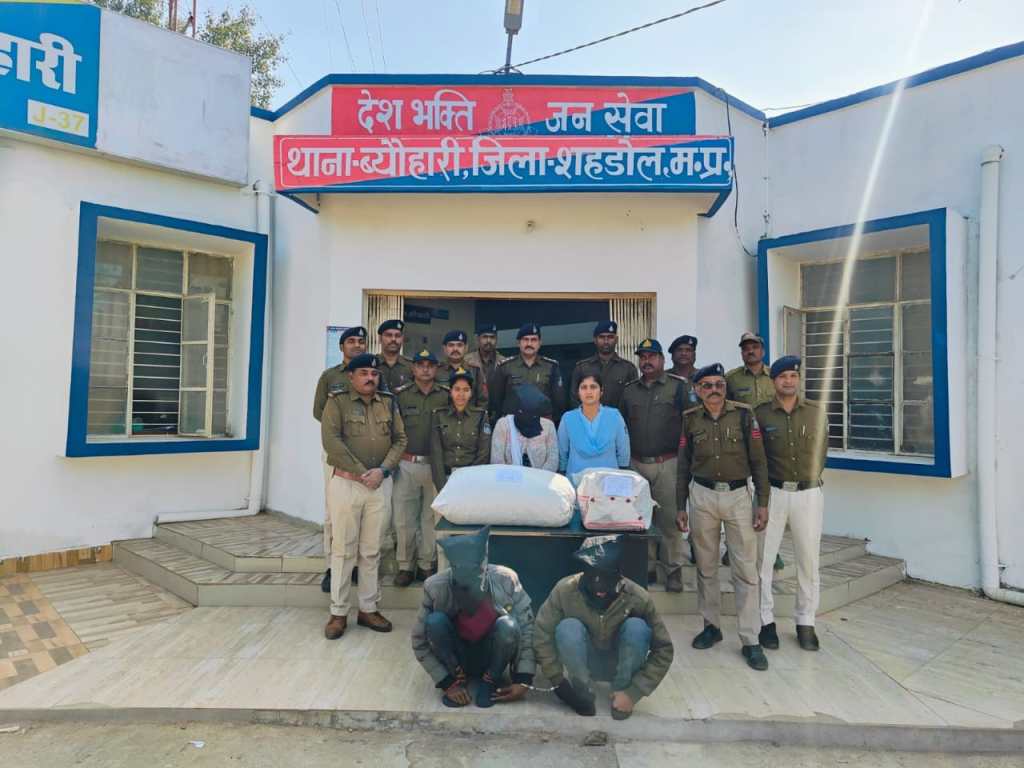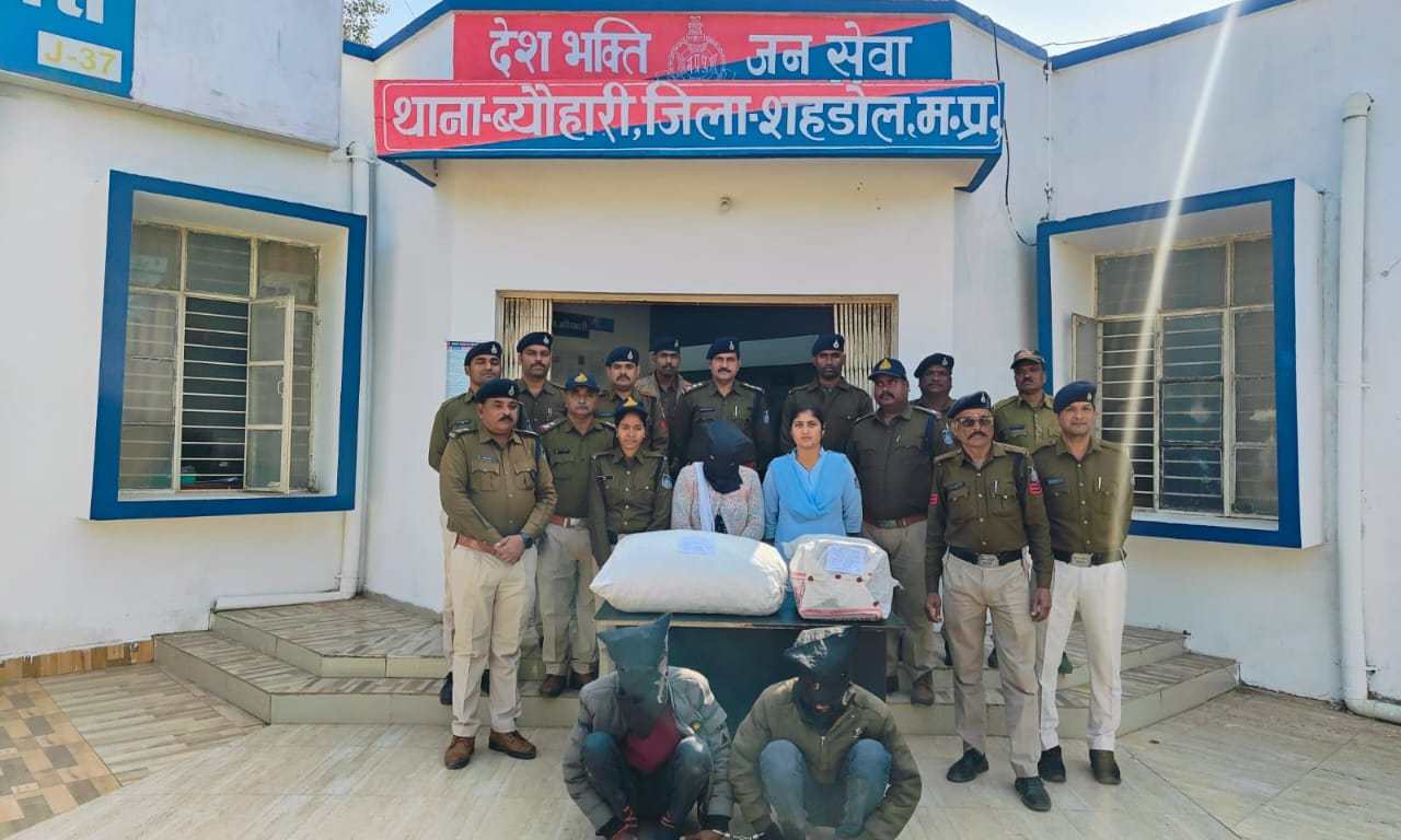 दिनांक 7, 1 ,2025 को ब्योहारी।पुलिस को इस आशय की मुखबिर सूचना प्राप्त हुई की यशवंत पटेल पिता राम किशोर पटेल निवासी ग्राम बिजहा अपनी स्कूटी में पुष्पेंद्र पटेल निवासी ग्राम खड्डा राजकुमारी पटेल निवासी ग्राम झरौसी को बैठकर शहडोल तरफ से व्योहारी की ओर आने वाले हैं पुष्पेंद्र पटेल राजकुमारी पटेल दोनों एक एक टाली बैग रखे हैं जिसमें भारी मात्रा में मादक पदार्थ गंजा रखे हुए हैं सूचना पर थाना प्रभारी द्वारा तत्काल पुलिस टीम गठित कर शहडोल रीवा मार्ग में न्यू बरौंधा पहुंचकर नाकाबंदी की गई इसी बीच शहडोल तरफ से मुखबिर द्वारा बताई गई स्कूटी क्रमांक एमपी 18 जी 3174 में 2 पुरुष एव एक महिला बैठकर शहडोल तरफ से व्योहारी तरफ आते हुए दिखे जिन्हें रोक कर नाम पता पूछने पर स्कूटी चालक ने अपना नाम यशवंत पटेल पिता रामकिशोर पटेल उम्र 23 वर्ष निवासी ग्राम बिजहा स्कूटी चालक के पीछे बैठे व्यक्ति ने अपना नाम पुष्पेंद्र पटेल पिता विमलेश पटेल उम्र 26 वर्ष निवासी ग्राम खड्डा तथा राजकुमारी पटेल पति सुनील पटेल उम्र 27 वर्ष निवासी ग्राम झरौसी बताएं आरोपियों की तलाशी लिए जाने पर आरोपियों के पास मिले दो टाली बैग में कुल 23 किलो 500 ग्राम गांजा कीमती 2 लाख 58 हजार का जप्त किया गया है
