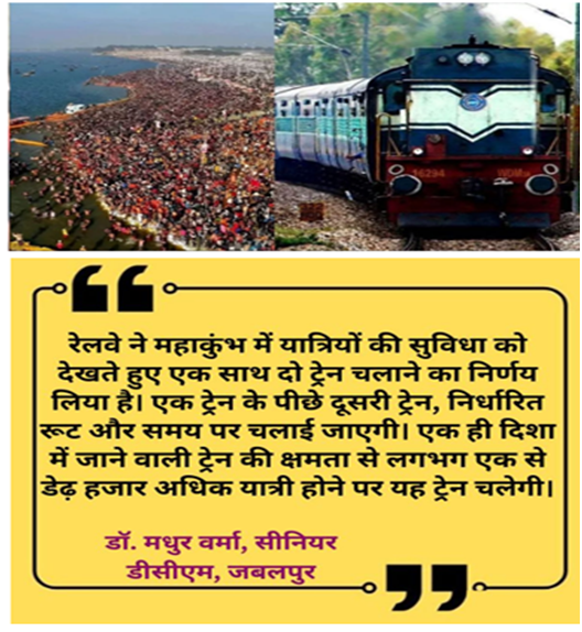 - महाकुंभ के दौरान प्रयागराज मंडल की सीमा से लगे जबलपुर रेल मंडल समेत अन्य रेल मंडल के स्टेशनों में यात्रियों की भीड़ बढ़ते ही एक साथ दो ट्रेनों को चलाएगा। इनमें यात्री जनरल टिकट पर यात्रा कर सकेंगे।