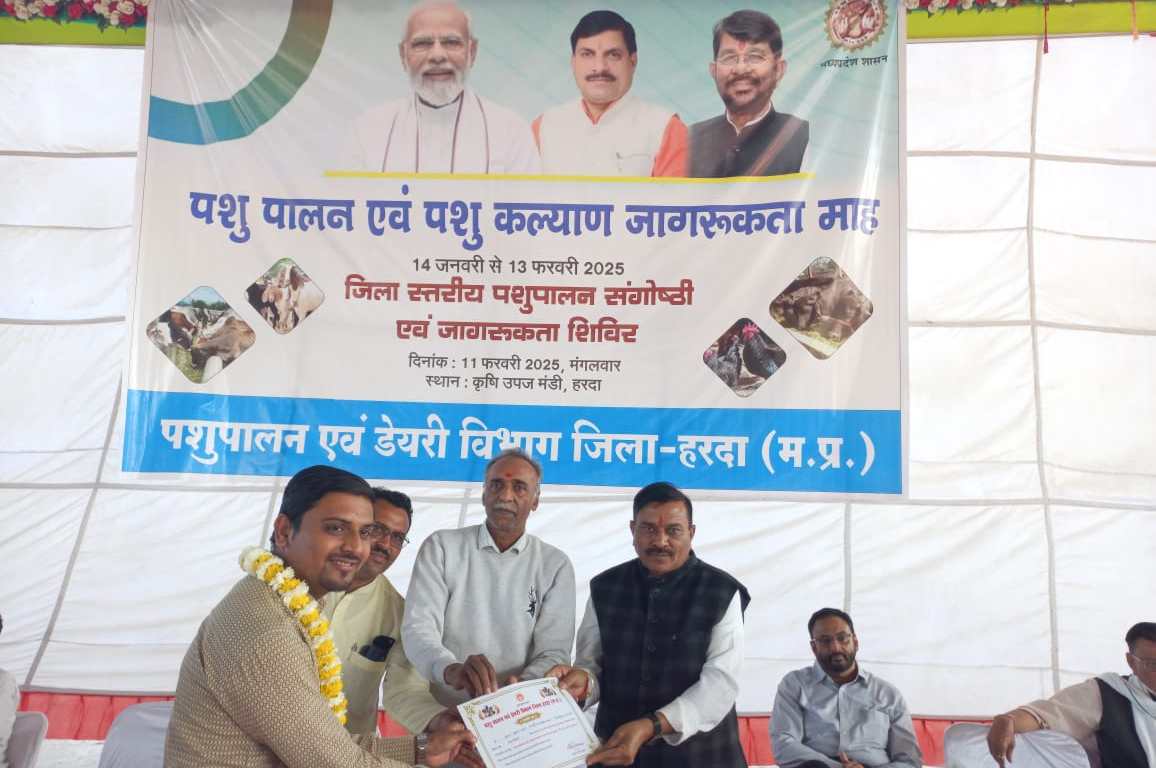 हरदा 11 फरवरी 2025/ पशुपालन एवं पशुकल्याण जागरूकता अभियान अंतर्गत मंगलवार को जिला स्तरीय पशुपालन संगोष्ठी एवं पशुकल्याण जागरूकता कार्यक्रम का आयोजन स्थानीय कृषि उपज मंडी हरदा में किया गया। हरदा विधायक डॉ. आर. के. दोगने ने इस अवसर पर कहा कि किसान भाई खेती के साथ-साथ पशु पालन करके अपनी आय बढ़ा सकते है। कार्यक्रम में जिला पंचायत उपाध्यक्ष श्री दर्शन सिंह गहलोत ने उपस्थित पशुपालकों को पशुपालन की उन्नत तकनीक अपनाने की सलाह दी।इस अवसर पर कृषि विज्ञान केन्द्र हरदा के डॉ. मुकेश बकोलीया, कृषि विभाग के सहायक संचालक डॉ. भागवत सिंह, म.प्र. राज्य आजीविका मिशन के प्रतिनिधी एवं पशुपालन विभाग के समस्त अधिकारी कर्मचारी कार्यक्रम में उपस्थित थे। कार्यक्रम में विषय विशेषज्ञों द्वारा पशुपालन से संबंधित सभी विषयों पर उपयोगी जानकारियां दी गई। इस अवसर पर अतिथियों द्वारा जिले की गौशाला संचालकों, पशु सखियों, गौसेवक, प्रगतिशील पशुपालकों को प्रशस्ति पत्र प्रदान किये गये।
