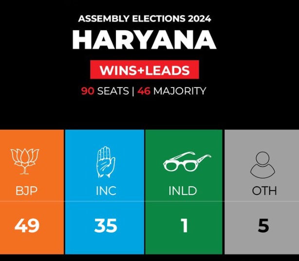 लोकमत सत्याग्रह/हरियाणा चुनाव आयोग की वेबसाइट के अनुसार, हरियाणा विधानसभा चुनाव के रुझानों में 12:50 बजे तक भाजपा 49 जबकि कॉन्ग्रेस 35 सीटों पर आगे है। यदि यही रूझान बने रहे तो भाजपा की तीसरी बार हरियाणा में सरकार बन जाएगी और उसे स्पष्ट बहुमत होगा। यह उसकी हरियाणा में अब तक की सबसे बड़ी जीत होगी। मंगलवार (8 अक्टूबर, 2024) को हरियाणा विधानसभा चुनाव … Continue reading हरियाणा में लगातार तीसरी बार बीजेपी सरकार के आसार से गुस्साई कॉन्ग्रेस, चुनाव आयोग को की शिकायत !